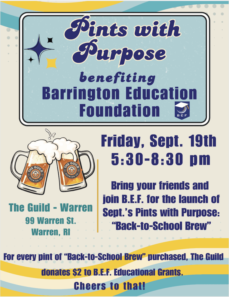 Friday, Sept. 19, 2025 from 5:30 – 8:30 pm, join us for the launch of “Back-to-School Brew” at The Guild Warren – a special September brew just for B.E.F.! Bring your friends and enjoy a fun, relaxed gathering. Thank you to The Guild Warren for supporting Barrington Education Foundation during the last two weeks of September.